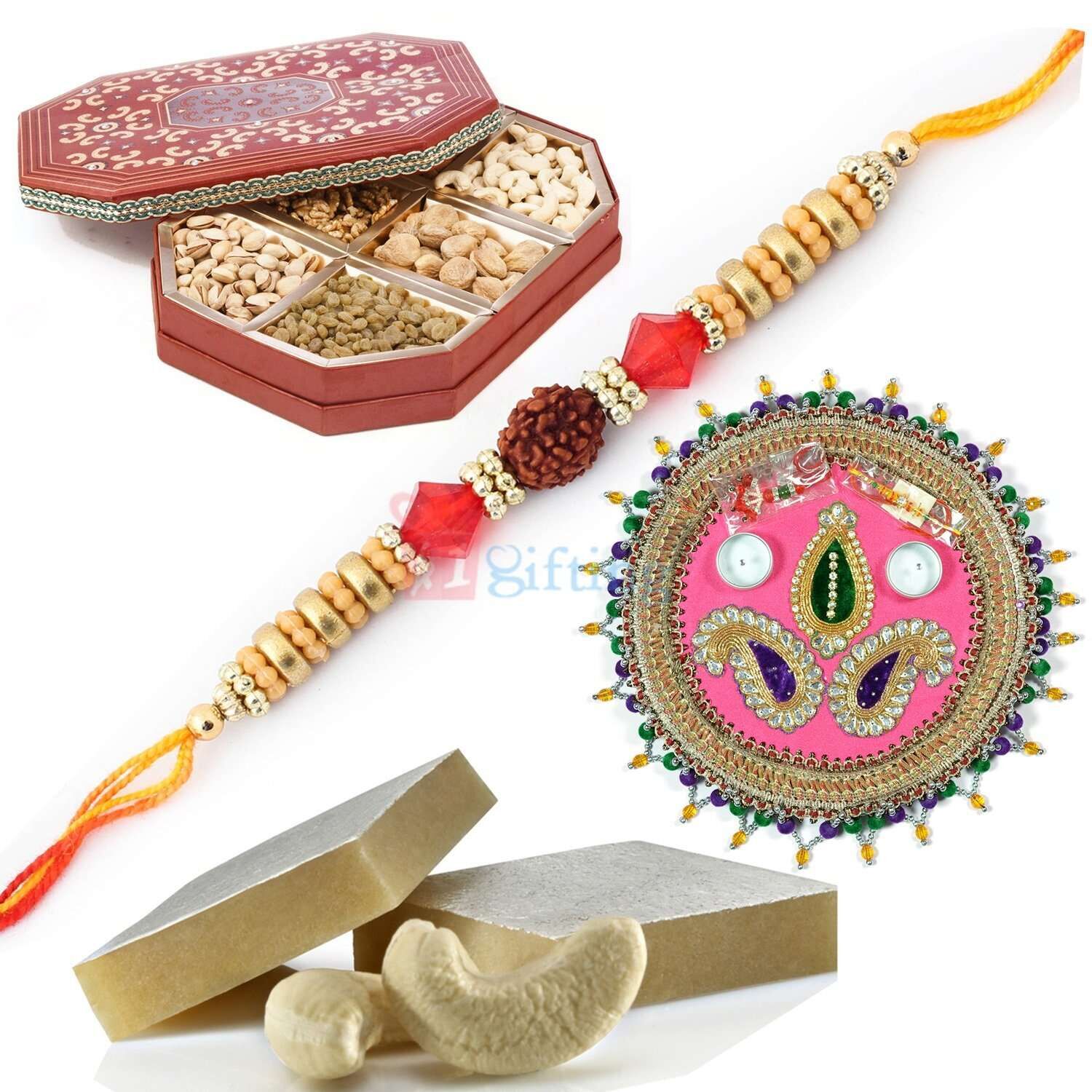 Buy Combo Gift on Rakhi with Rakhi Pooja Thali Sweets Dry Fruit Box and Rakhi